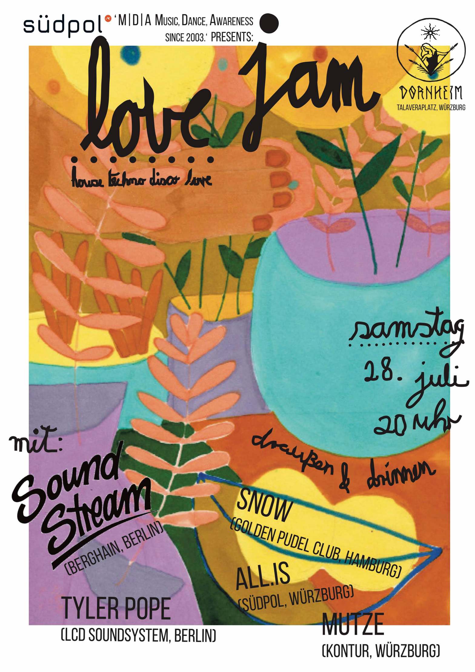 Die Idee zur Love Jam ist Anfang Mai in Berlin entstanden. Neue Freunde, die man erst seit wenigen Momenten kennt und doch fühlt, dass man sich schon ewig kennt. Die gemeinsame Vision ist im selben Atemzug da: eine Energie in die Clubs zu bringen die deeper geht, als die ausschliessliche Definition über Namen, Betäubung, Aussehen. Darum ging es genau genommen schon 2003 als der Südpol das Licht der Welt erblickte und das Ziel hatte „So weit wie noch nie.“ Damals wie heute loten wir gemeinam die Grenzen aus. Wie weit geht es? Worum geht es? Im Grunde doch immer um die Liebe. Also lasst uns einfach gemeinsam jammen und schaun was geht! Südpol M | D | A since 2003.